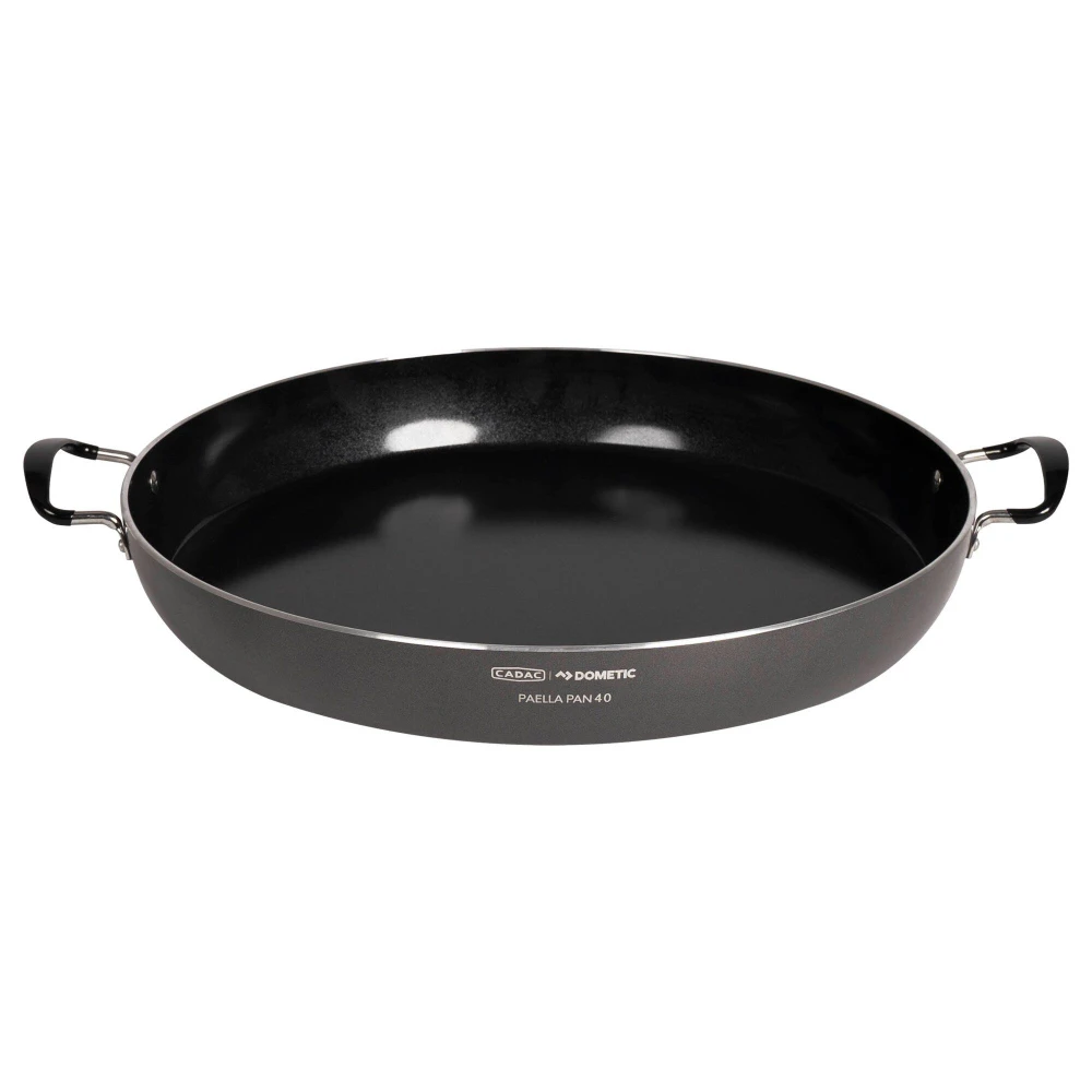 Die leichte Pfanne aus dickwandigem, keramikbeschichtetem Aluminium mit Edelstahl-Handgriffen ist einfach in der Handhabung und leicht zu reinigen. Die Unterseite der Pfanne hat eine stahlgefräste Fläche. Die große Kochfläche ist ideal für die Zubereitung von Risotto, Paella, Pasta-Gerichten, Frühstück und anderen Mahlzeiten für größere Gruppen.