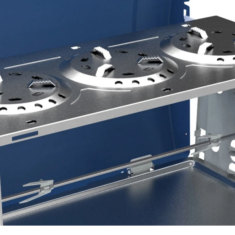 Hochwertiger Kocher mit drei Kochplatten und einer separaten Grillfläche von ca. 1.508 qcm. Mit dem Koffergasgrill 200 SGR können Sie leckere Beilagen auf den oberen Herdplatten zubereiten, während darunter ein Hähnchen am Spieß oder Fisch gegrillt wird. Da die Hitzeabstrahlung von oben erfolgt, tropfen Marinade und Fett beim Grillen nach unten, treffen hier auf keine Hitzequelle und können somit keine Stichflammen verursachen.