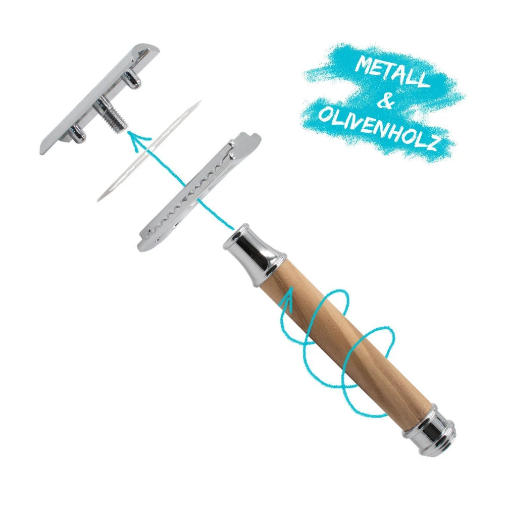- Nachhaltige Materialien: Der Holzgriff des Nassrasierers besteht aus Olivenholz aus kontrolliertem Anbau und liegt gut und rutschfest in der Hand. Die Rasierklingen und der geschlossene Kamm sind aus Metall gefertigt und recycelbar.