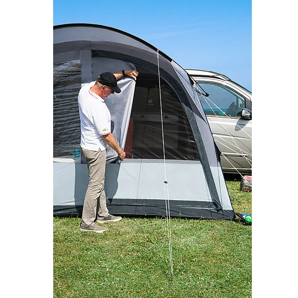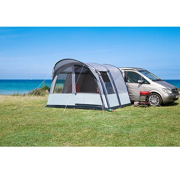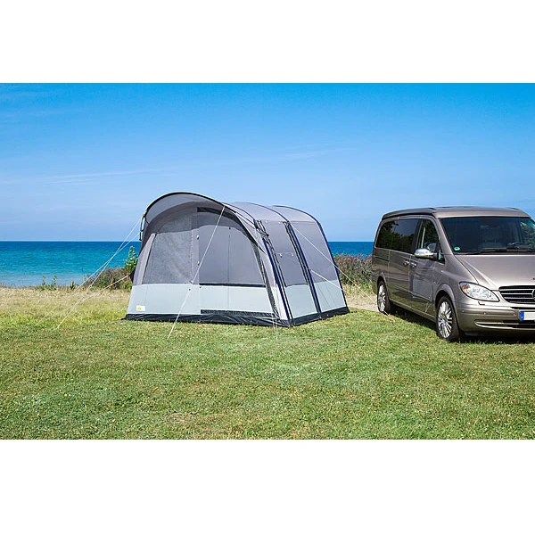 Das Buszelt Rapid Air II überzeugt mit dieser modifizierten Ausstattung in allen Belangen. Das Vordach schützt die Vorderwand, die zahlreichen Gaze- Einsätze ermöglichen Querventilationen, das kinderleicht zu betätigende Air-In-System lädt auch zum Aufbau bei kurzen Aufenthalten ein. Inklusive Zeltboden.