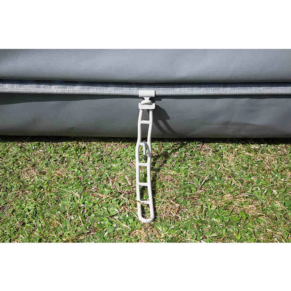 - alle Wandteile verfügen am unteren Ende über einen doppelten Erdstreifen mit einer dazwischen vorhandenen flexiblen Bodenabspannung. Die Abspannpunkte sind damit frei wählbar