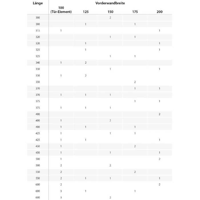 Achten Sie bei der Wahl der unterschiedlichen Vorderwandbreiten darauf, dass Ihre Vorderwand aus mindestens 2 Teilen mit einer Breite größer 100 cm besteht. Mit der Breite 100 (Türelement bzw. Fensterelement) können Sie auf das gewünschte Maß ergänzen.