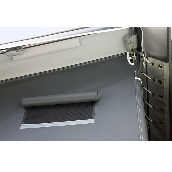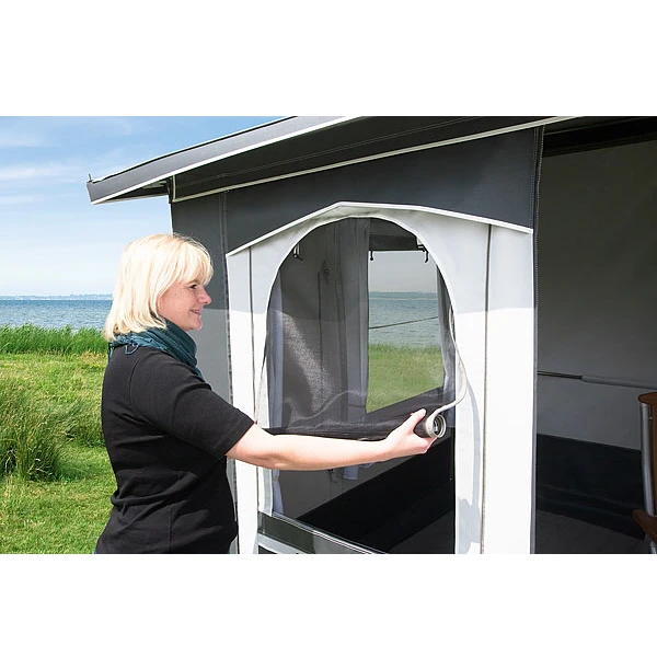 Vorderwand: 4-teilig, alle Teile sind gegeneinander austauschbar; hochrollbare Eingangstür; 1 Panoramafenster-Plus-Segment, Fenster kann mit Reißverschluss geöffnet und die Gaze dahinter geschlossen werden. Fensterklappen mit Reißverschluss verschließbar, Segmente können zur Veranda abgeklappt werden, senkrechte Hohlsäume mit Klettund Flauschband (90 cm) und waagerechte Hohlsäume mit Klett- und Flauschband (60 cm) zur Befestigung von Zusatzstangen an der Zelthaut.