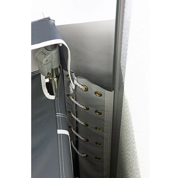 Rückwand: 2-teilig, einzeln herausnehmbar, waagerechter Hohlsaum auf Höhe ca. 120 cm zur Verstärkung der Wand, wenn das Zelt frei und ohne Wohnwagen steht. Überwurfschleuse mit Seil und Zuglaschen, Tiefe ca. 50 cm; Befestigung erfolgt über einen in die Kederschiene des Wohnwagens eingezogenen Ösenstreifen, der mit dem Zelt verbunden wird.