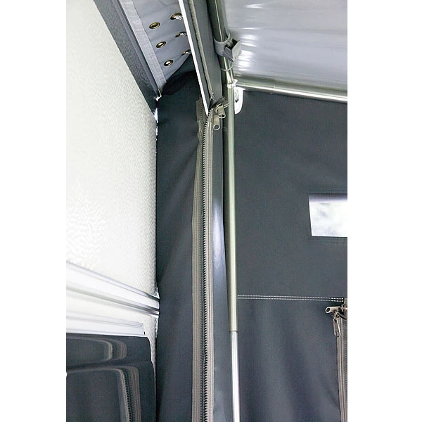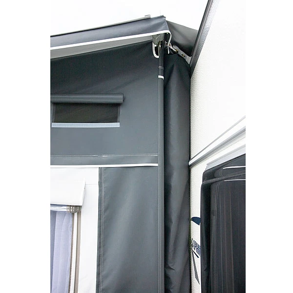 Sie fahren mit Ihrem Reisezelt in den Urlaub und Ihr festes Zelt bleibt am Platz stehen. Sie ersparen sich mehrmaliges Aufbauen und haben für die Reisezeit ein leichtes Zelt oder Sonnendach dabei. Dieses Teilzelt ist freistehend und wird über eine einfache, aber dennoch stabile Verbindung am Wohnwagen befestigt. Für Wohnwagen mit einer Höhe von 235-250 cm.