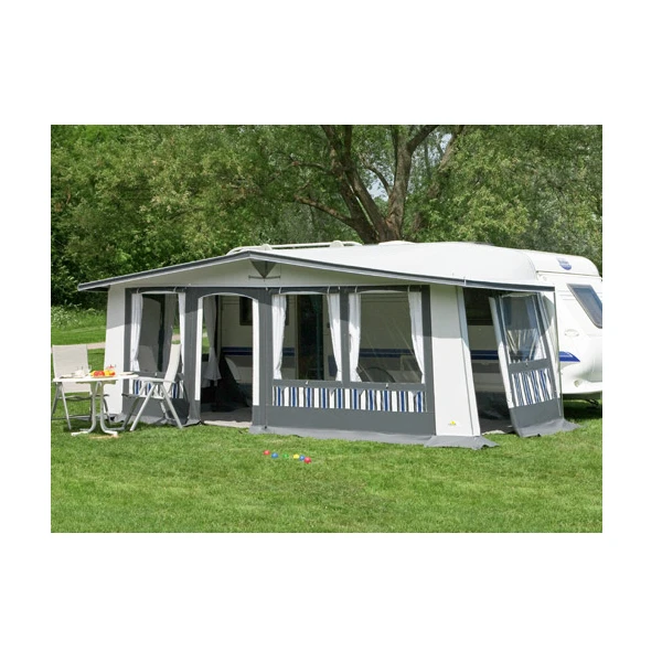 Seitenwände: herausnehmbar; Eingangstür seitlich wegrollbar; Gaze-/ Folienfenster; doppelte Fensterklappen mit Reißverschluss verschließbar; Fenster mit Gardinen bestückt; senkrechter und waagerechter Hohlsaum für Sturmgestänge mit Klettverschluss; Erkeranbau an der rechten Seite möglich.