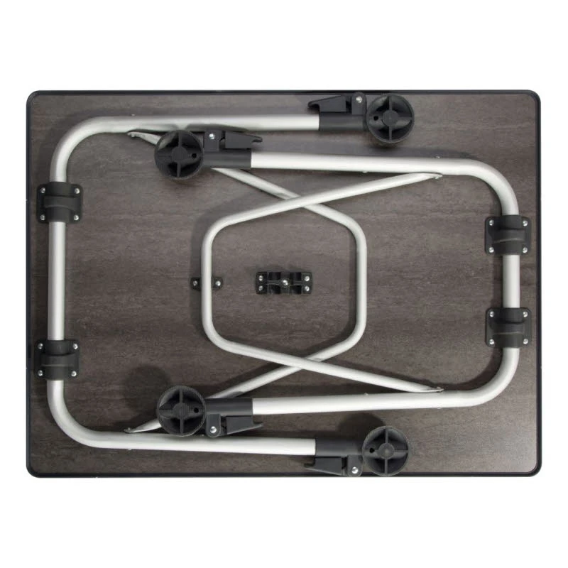 Mit seinem Gestell aus Aluminium besticht der Tisch als Leichtgewicht mit hoher Stabilität. Große, kugelgelagerte Fußteller ermöglichen einen sehr guten Stand auch in ungleichmäßigem Gelände. Alle vier Tischbeine sind höhenverstellbar. Die Tischplatte ist wetterfest und hitzbebeständig.