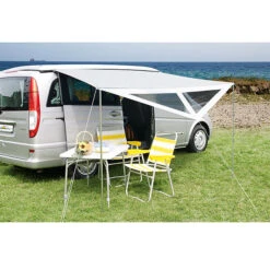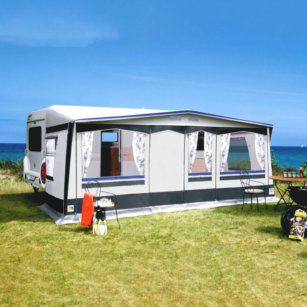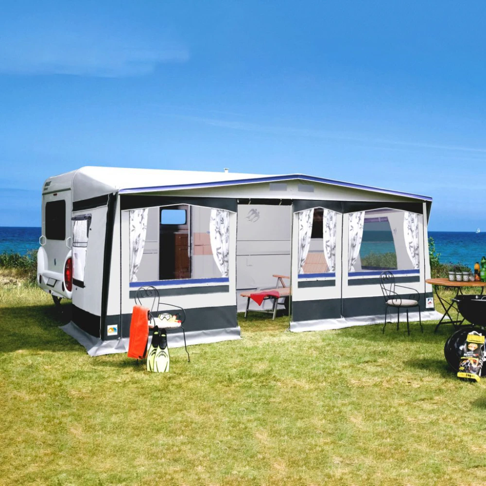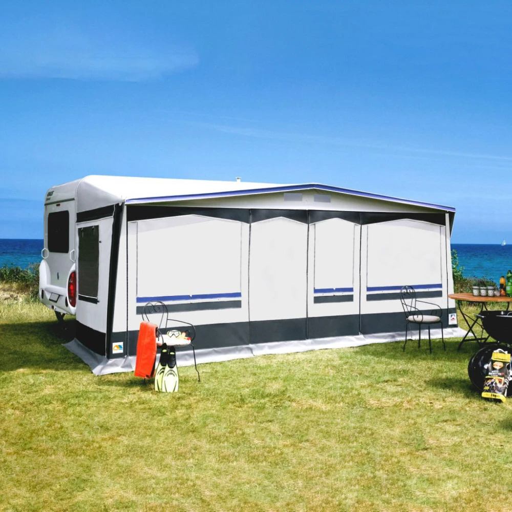 7-teiliges Vorzelt für alle, die mehr wollen. Außenliegender Erdstreifen, innen abspannbar, Sturmlaschen in der Vorderwand. Auch als Sonnendach nutzbar, da Seitenwände und Vorderwand herausnehmbar sind. Abgedeckte Reißverschlüsse. Passend auch für Fahrzeuge mit aerodynamischer Bugform.