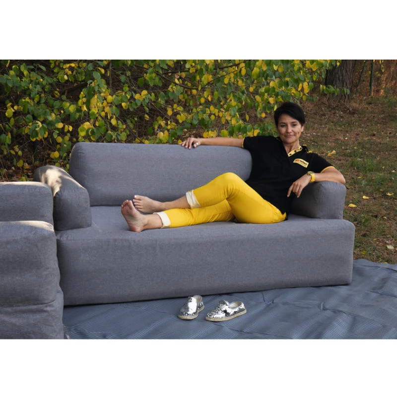 Aufblasbares Sofa unserer Trendmarke Holiday Travel ist ein echter Hingucker. In grau-meliertem 600D Polyester, der UV 30+ beständig ist. Der Boden ist mit Tarpaulin überzogen. Zum Aufblasen ist eine 230 V Pumpe integriert.