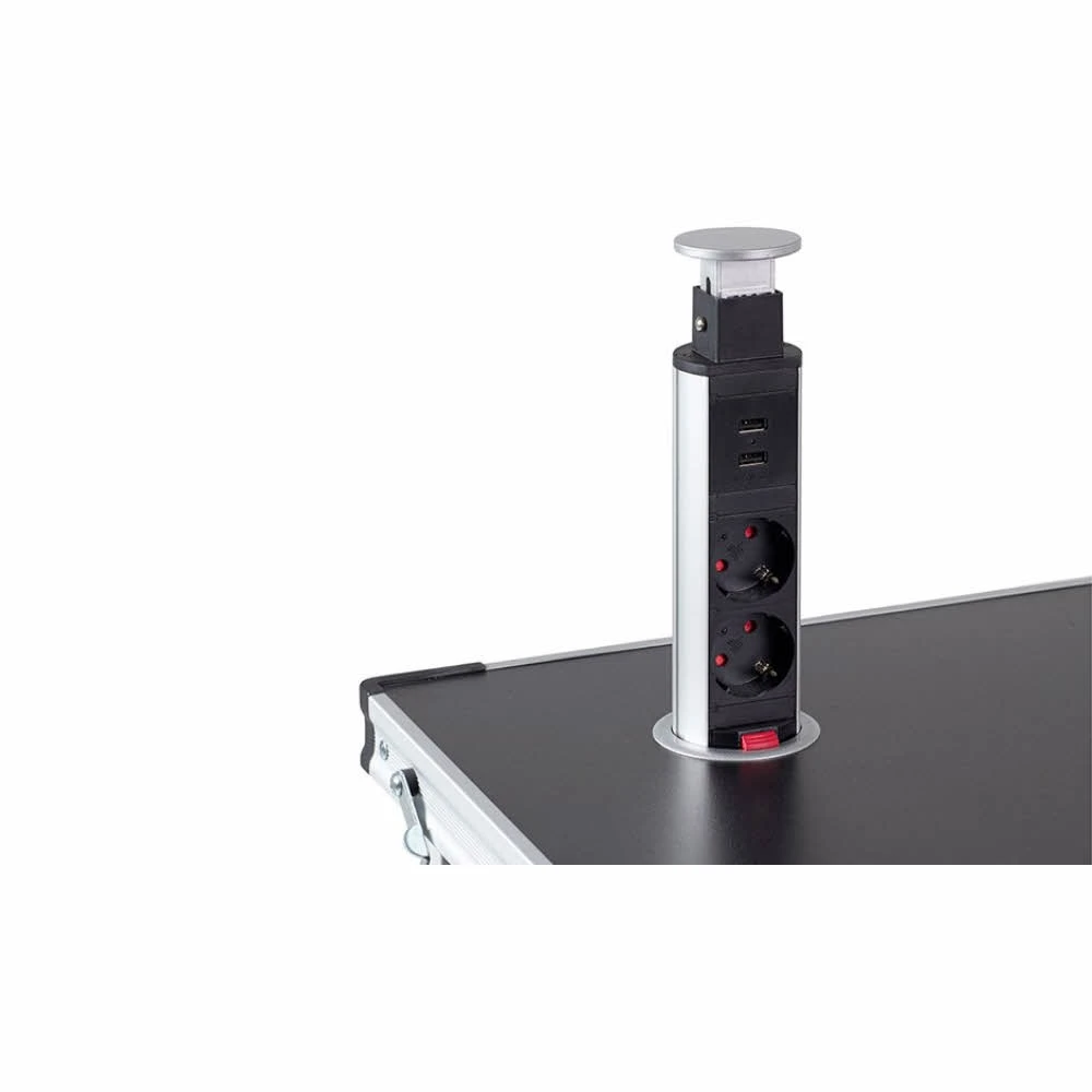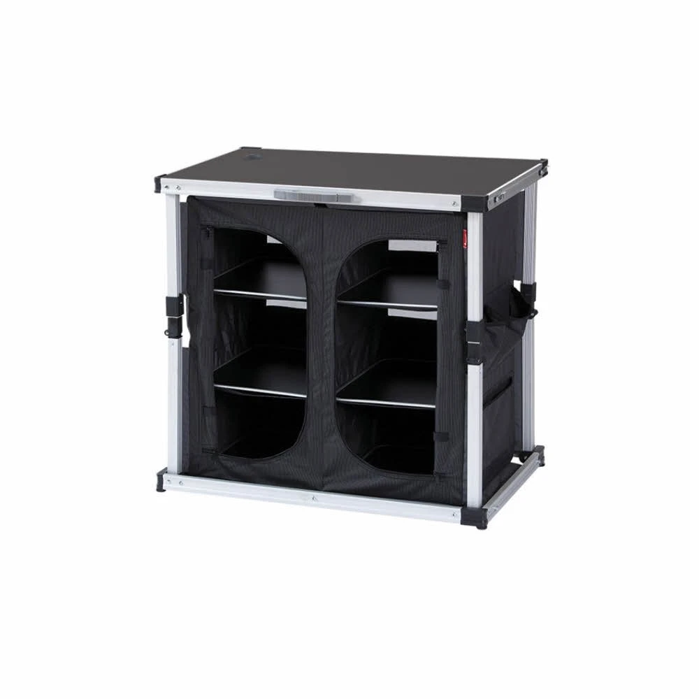 Aufbewahrungsschrank Double mit 6 Ablagen und stabilem Deckel. Für stabilen Stand sorgen 4 verstellbare Schrauben an der Bodenplatte. Dank einer intelligenten Klapptechnik ist der Isabella Aufbewahrungsschrank in wenigen Sekunden auf- und wieder abgebaut. Ideal für den schnellen Transport da zusammenlegbar wie ein Koffer. Inklusive Transporttasche.