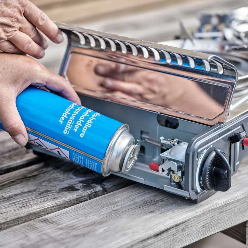 Standortunabhängig Kochen durch ein Kartuschensystem. 2 Standard Butangas-Kartuschen (nicht im Lieferumfang enthalten) werden links und rechts einfach eingesteckt.