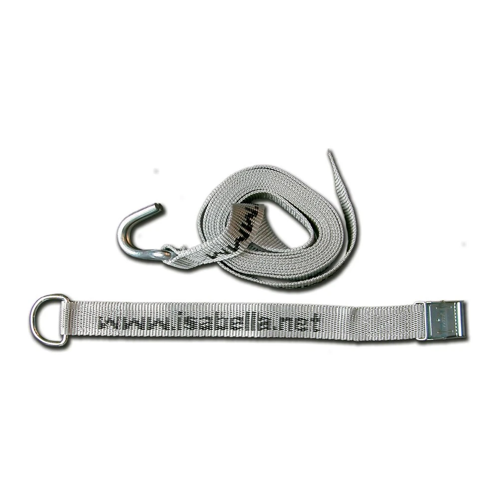 Die Isabella-Sturmsicherung wird von innen am Gestänge montiert und sichert zusätzlich jedes Sonnendach oder Vorzelt bei starkem Wind. Durch die innenliegende Montage ergeben sich keine Scheuerstellen am Dach. Auch Stolperfallen werden vermieden. Es werden 2 Sturmsicherungen pro Zelt (für linke und rechte Vorzeltecke) empfohlen. Bei großen Zelten kann zur Sicherheit noch die mittlere Stützstange mit einer zusätzlichen Isabella Sturmsicherung gesichert werden.