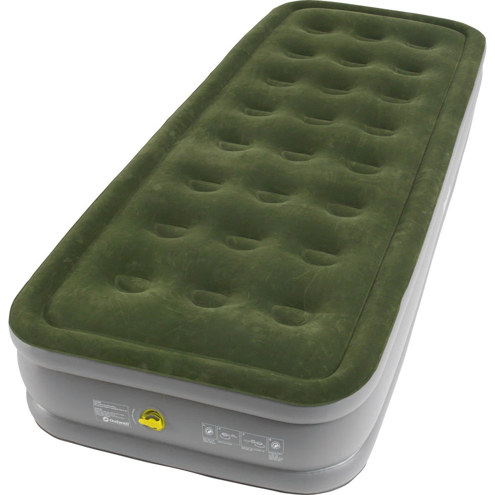 Extra hohes, aus starkem PVC gefertigtes Luftbett, das mit verstärkten Ecken versehen ist. Zusammen mit der beflockten Oberseite ist so für hohen Schlafkomfort gesorgt.