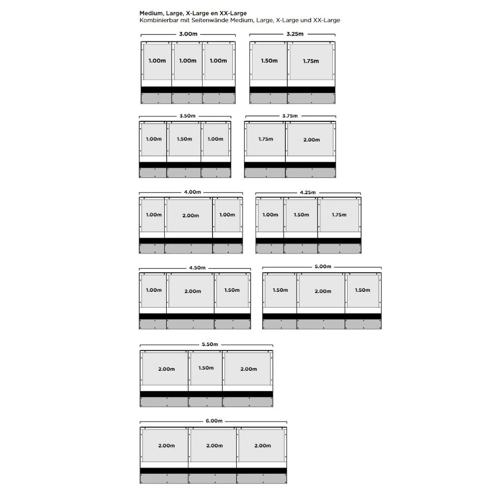 Verschiedene Längen können zu einer kompakten Front und auch direkt mit einem Rain Blocker Seitenteil verbunden werden um unter der Markise einen privateren, windgeschützen Bereich zu schaffen.