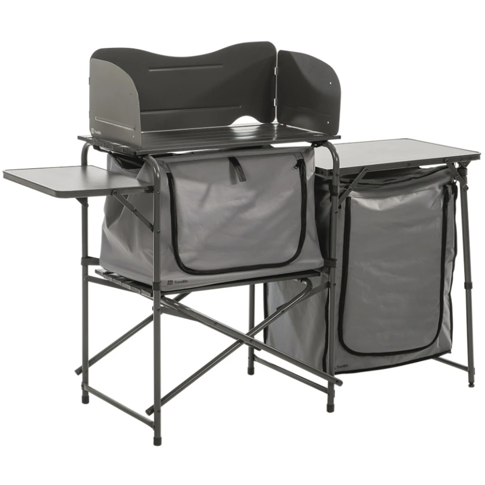 Mit der Toledo Küche bringen Sie ein bisschen mehr Luxus mit in den Urlaub. Diese Küche ist mit ihrem wasserabweisenden und UV-beständigen Stoff perfekt für den Außenbereich geeignet. Darüber hinaus verfügt die Küche über eine Windschutzscheibe und einen zusätzlichen Beistelltisch. Die Küche ist mit drei Staufächern für Ihre Küchenutensilien ausgestattet. Dank des einfachen Faltsystems können Sie die Küche zu einem kleinen Packmaß zusammenfalten.