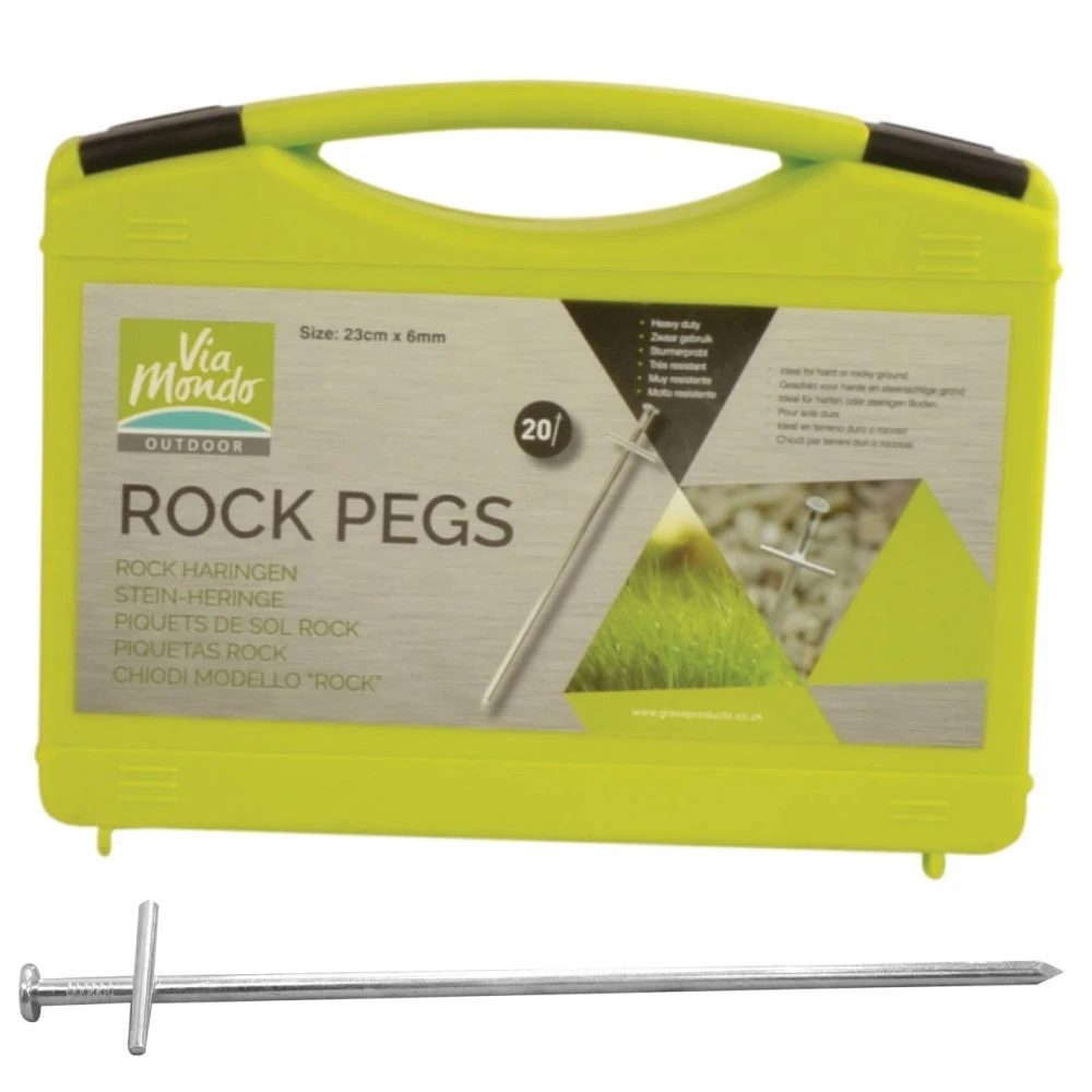 Inhalt: 20 Felsbodenheringe mit Stift, 23 cm lang, D=6 mm, für harte und steinige Böden. Inklusive Kunststoffkoffer.