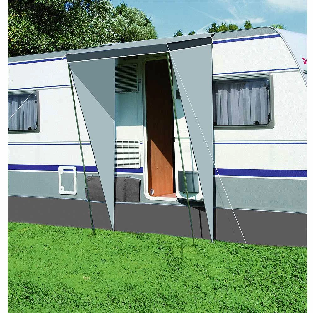 Schützt den Eingang – insobesondere bei Regen und ermöglicht, dass die Tür geöffnet bleiben kann. Die Markise wird in die Kederleiste des Wagens eingezogen, zwei teleskopierbare Aufstellstäbe eingestellt und so weit ausgefahren, dass die hinteren Kanten der Seitenkeile am Fahrzeug anliegen. Nun werden die Keile entweder an der Unterkante des Wohnwagens eingehängt oder durch zwei kurze Spannschnüre mit Heringen im Erdreich befestigt. Zwei Spannschnüre spannen das Dach entsprechend aus.